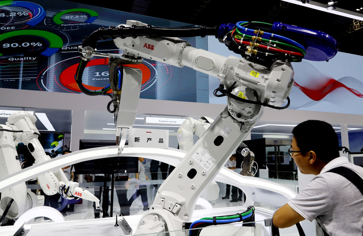 近日在上海舉行的第23屆中國國際工業(yè)博覽會上,參觀者在一組ABB機(jī)器人靜態(tài)展示展品前駐足觀看。新華社記者方喆 攝