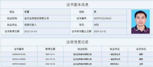 李喜目前就任金元證券保薦代表人崗位,學(xué)歷為本科,曾任職信達(dá)證券,在2011年加入金元證券,2012年獲得保薦代表人執(zhí)業(yè)資格,從業(yè)證書(shū)有效期截至2018年12月31日。