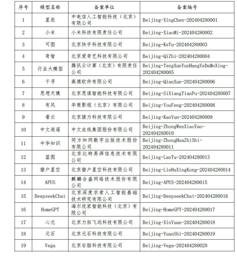 北京市新增19款已完成備案生成式人工智能服務(wù)名單 包括星辰、小米等模型