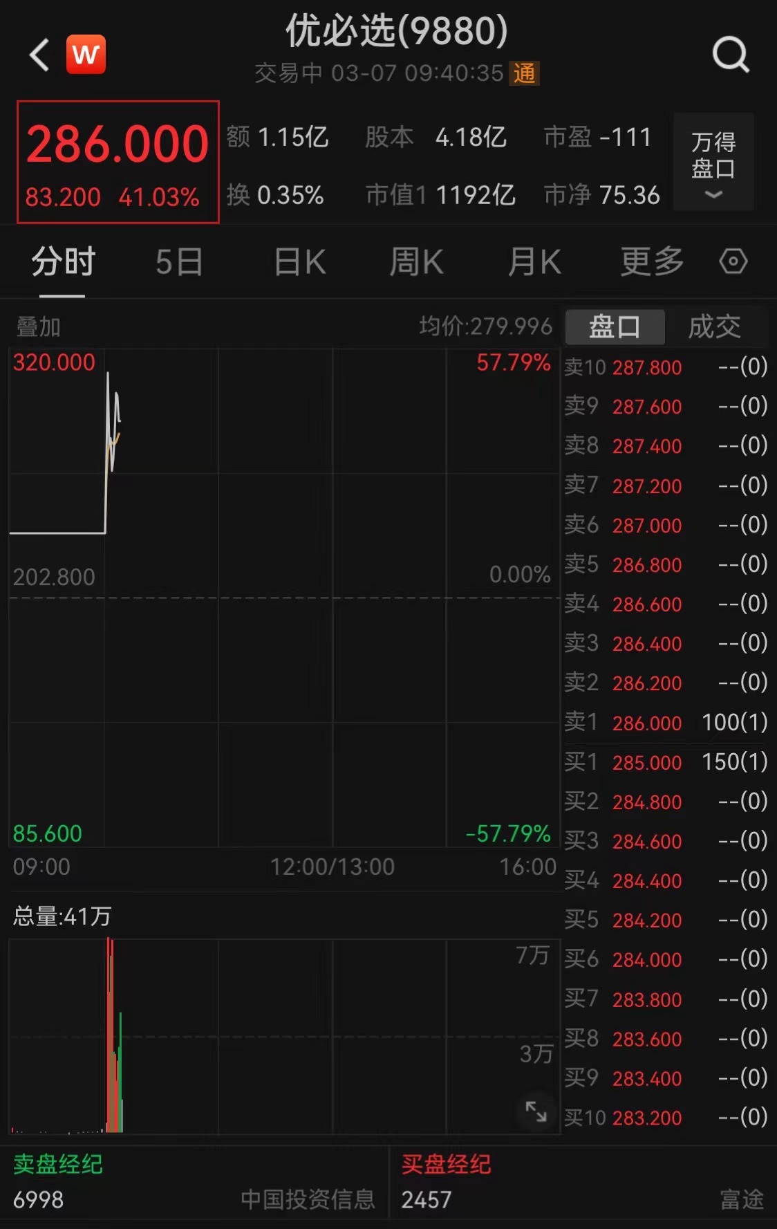 截至9時(shí)40分,優(yōu)必選股價(jià)上漲41.03%,報(bào)286港元/股,最新市值為1192億港元。