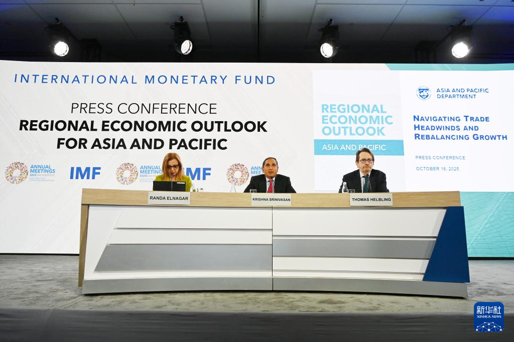 ??10月16日,在美國(guó)華盛頓,國(guó)際貨幣基金組織(IMF)亞太部主任斯里尼瓦桑(中)在新聞發(fā)布會(huì)上講話。新華社記者 李睿 攝