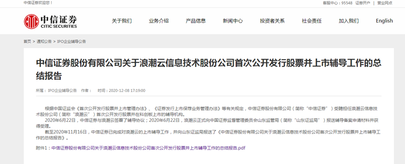 據(jù)中信證券官網(wǎng)12月9日消息,截至2020年11月16日,中信證券已完成對浪潮云的科創(chuàng)板上市輔導(dǎo)工作,并向山東證監(jiān)局報送了《中信證券股份有限公司關(guān)于浪潮云信息技術(shù)股份公司首次公開發(fā)行股票并上市輔導(dǎo)工作的總結(jié)報告》。