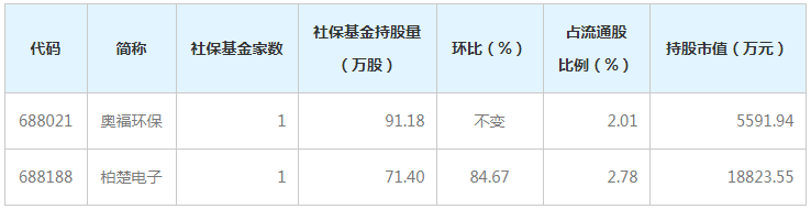 去年年末社保基金出現(xiàn)在奧福環(huán)保、柏楚電子前十大流通股東榜。