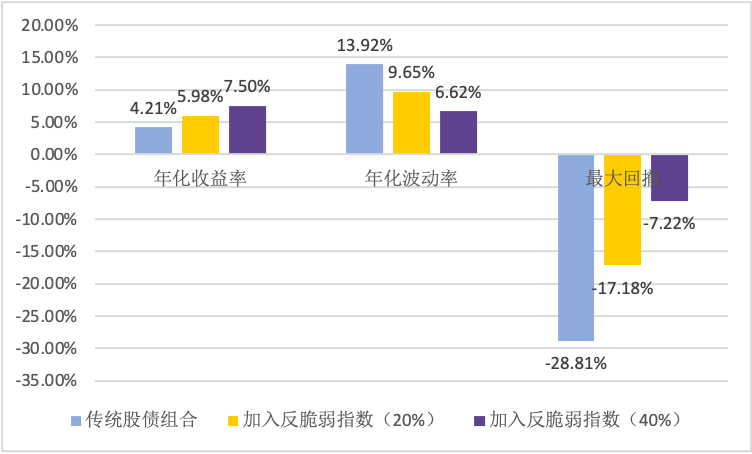 根據(jù)介紹,華鑫證券“反脆弱指數(shù)”可以疊加到各類策略組合之中,組合各項風險收益指標均會有較為顯著的優(yōu)化提升,且對組合的優(yōu)化效果隨著反脆弱策略權(quán)重的提升而不斷增加;販y數(shù)據(jù)顯示,反脆弱策略配置權(quán)重為20%的情況下,新組合整體年化收益率相比原組合提升了約55%,年化波動率減少了約32%,最大回撤更是減少了約45%。