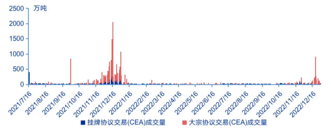 碳市場(chǎng)履約驅(qū)動(dòng)特征明顯,2022年碳排放配額交易量總體下降,波峰大幅度萎縮。2022年全國(guó)碳市場(chǎng)碳排放配額(CEA)成交總量與成交總額分別為5089萬(wàn)噸和28.1億元,同比分別下降71.5%和63.3%,原因主要是我國(guó)碳市場(chǎng)目前的履約周期安排為兩年履約一次,2022年底并無(wú)履約清繳要求。與此同時(shí),全國(guó)碳市場(chǎng)交易仍存在明顯的“潮汐”現(xiàn)象,2022年CEA成交量主要集中于年末,11月、12月成交量分別為730萬(wàn)噸、2625萬(wàn)噸,兩個(gè)月總成交量占年總交易量的66%。