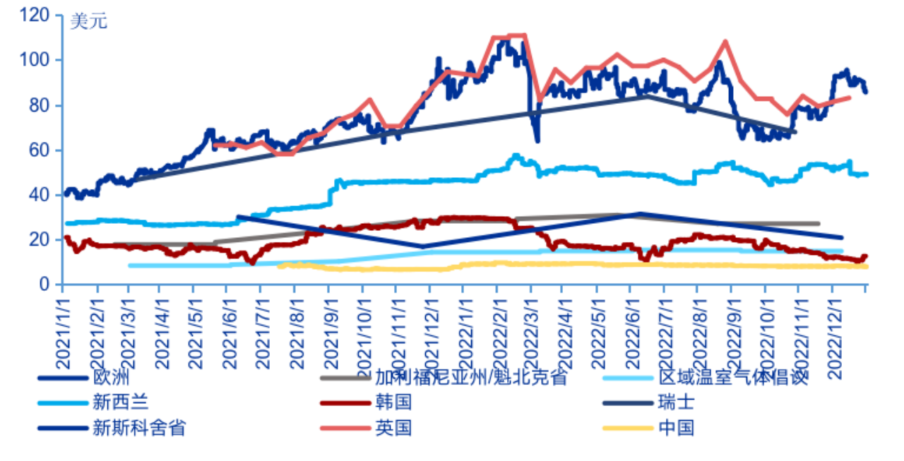 圖9:2021—2022年全球各碳市場(chǎng)成交價(jià)格走勢(shì)