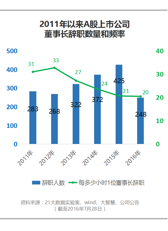 然而,21大數(shù)據(jù)實(shí)驗(yàn)室統(tǒng)計(jì)發(fā)現(xiàn),2016年截至7月28日,A股市場(chǎng)已有248位董事長(zhǎng)辭職,也就是說(shuō),平均不到1天就有1位上市公司董事長(zhǎng)辭職。
