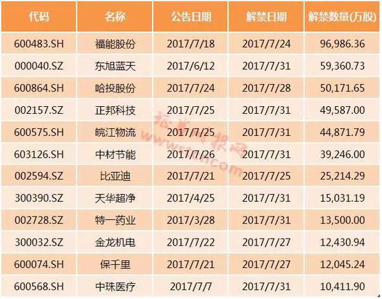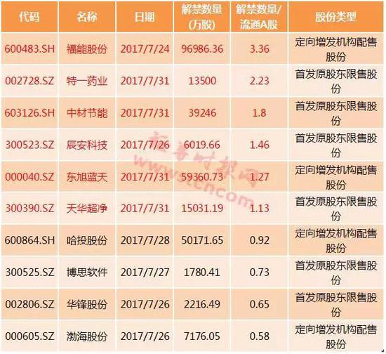 同花順iFinD數(shù)據(jù)顯示,7月24日至7月31日,合計(jì)有12家上市公司解禁股份超過(guò)1億股,其中福能股份限售解禁股數(shù)量高達(dá)9.7億股,已于7月24日到期,其次為東旭藍(lán)天,限售解禁股數(shù)量為5.94億股,將于7月31日到期,哈投股份解禁數(shù)量也逾5億股,于7月28日到期。