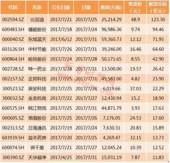 以下為解禁市值超過(guò)10億元的個(gè)股: