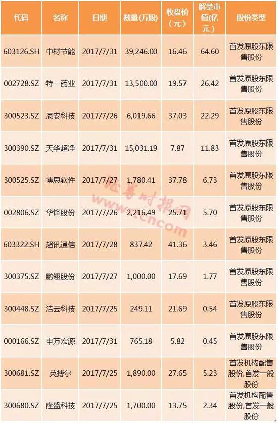 在7月最后一波解禁潮中,共有10家解禁股類(lèi)型為首發(fā)原股東限售股份,2家為首發(fā)機(jī)構(gòu)配售股份,28家為定向增發(fā)限售股份,15家為股權(quán)激勵(lì)限售股份,2家為追加承諾限售股份上市流通。