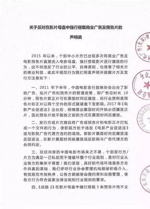 影院廣告方聯(lián)名投訴《戰(zhàn)狼2》8月9日,由北京萬達傳媒有限公司、分眾晶視廣告有限公司、北京暢游晶茂電影文化傳媒有限公司、時代廣告(北京)有限公司四家蓋章聯(lián)名發(fā)出的聲明函(落款日期為8月1日)稱,《戰(zhàn)狼2》在影片母盤中強行搭載5條預(yù)告片而不支付費用,嚴重踐踏影院廣告代理方的合法權(quán)益。