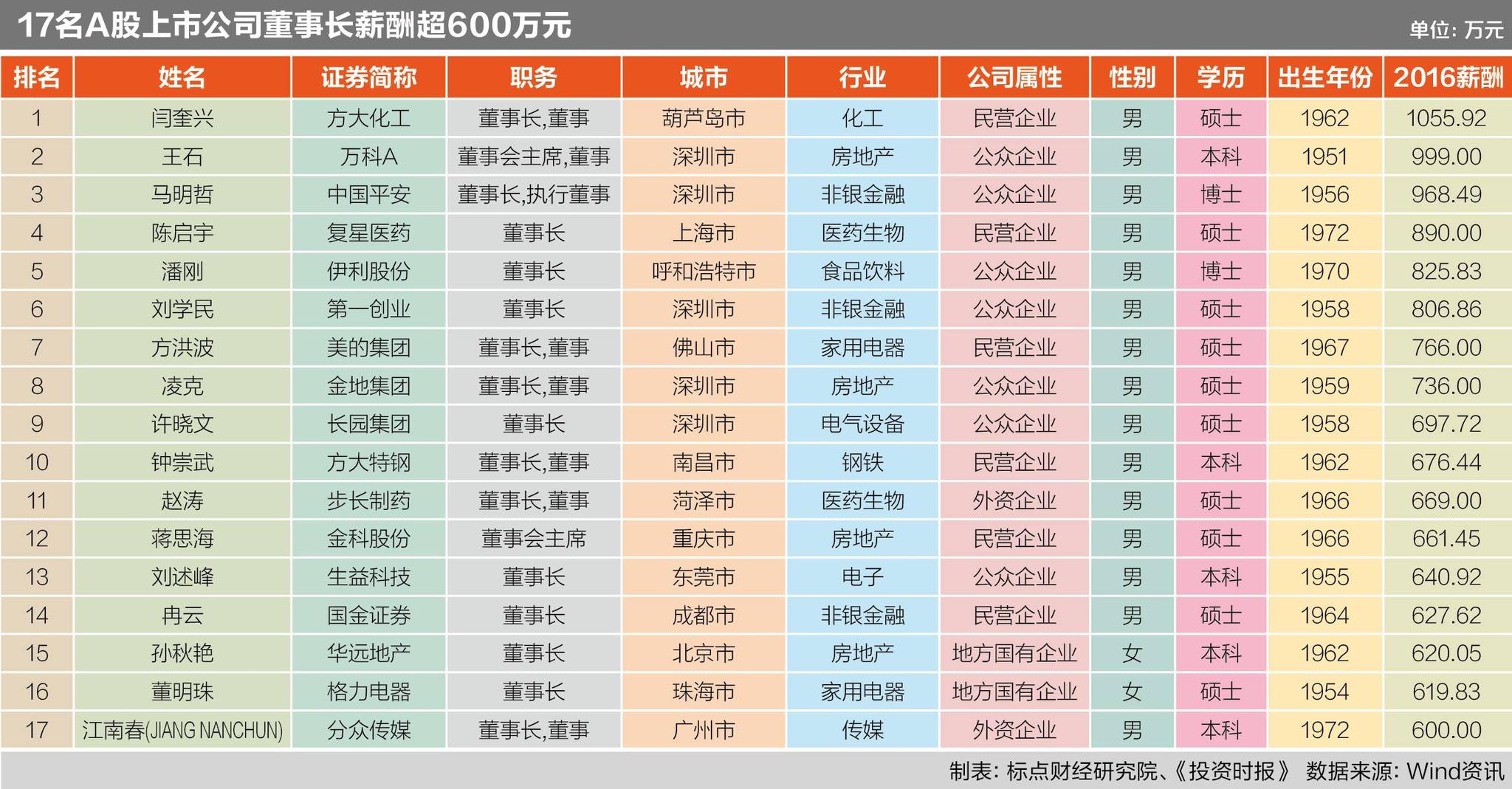 通過分析報(bào)告,《投資時(shí)報(bào)》記者發(fā)現(xiàn),薪酬在500萬元(含)以上的董事長(zhǎng)為26人,占比僅為1.05%,且較2015年減少5人。其中年薪超過千萬的董事長(zhǎng)僅方大化工董事長(zhǎng)閆奎興一人,其薪酬為1055.92萬元,較2015年增加518.52萬元,成為2016年漲薪金額最高的董事長(zhǎng)。