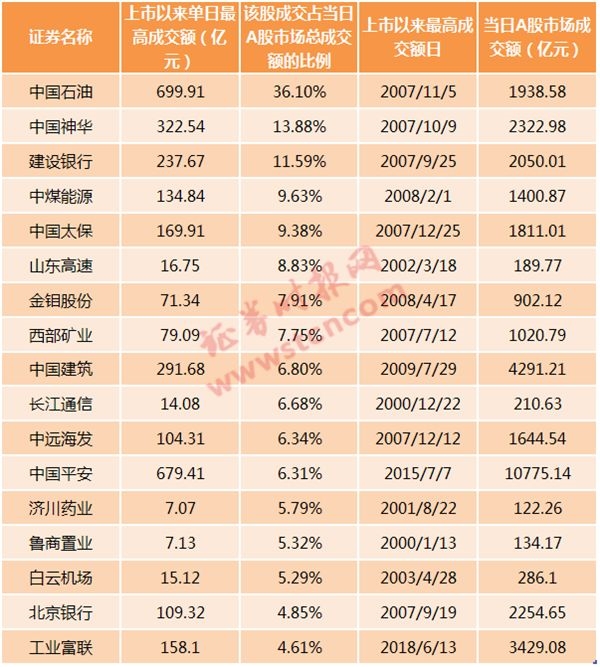 A股史上也有個(gè)股成交對(duì)市場“抽血”效應(yīng)比較嚴(yán)重的現(xiàn)象,以新股上市初期的情形居多,最為典型的要屬中國石油A股上市首日。