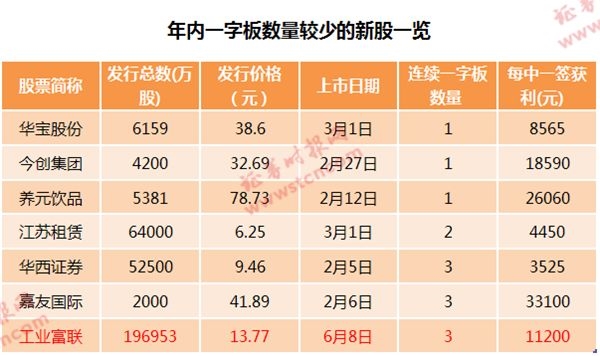 數(shù)據(jù)顯示,年內(nèi)新股連續(xù)一字板數(shù)量低于3個(gè)的僅有華寶股份、今創(chuàng)集團(tuán)、養(yǎng)元飲品、江蘇租賃等4只新股。除富士康外,連續(xù)一字板數(shù)量為3個(gè)的新股也僅有華西證券、嘉友國際兩只。