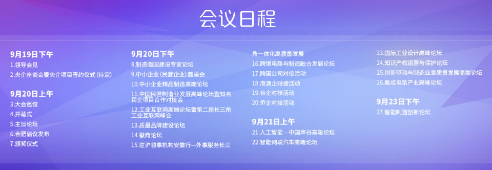 平行論壇:舉辦中小企業(yè)精品制造高端論壇、中國(guó)民營(yíng)制造業(yè)發(fā)展高峰論壇、工業(yè)互聯(lián)網(wǎng)高端論壇暨第二屆長(zhǎng)三角工業(yè)互聯(lián)網(wǎng)峰會(huì)、集成電路產(chǎn)業(yè)高端論壇、人工智能·中國(guó)聲谷高端論壇、智能網(wǎng)聯(lián)汽車高端論壇、國(guó)際工業(yè)設(shè)計(jì)高峰論壇、智能制造創(chuàng)新論壇、知識(shí)產(chǎn)權(quán)保護(hù)論壇、質(zhì)量品牌建設(shè)論壇、創(chuàng)新驅(qū)動(dòng)與制造業(yè)高質(zhì)量發(fā)展高端論壇、長(zhǎng)三角科技企業(yè)孵化器發(fā)展論壇等12場(chǎng)活動(dòng)。