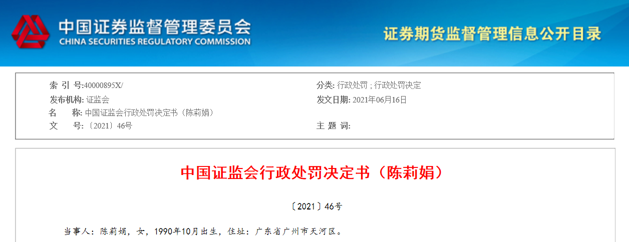 證監(jiān)會(huì)同日披露的另一則行政處罰決定書對(duì)陳莉娟內(nèi)幕交易樂通股份股票行為進(jìn)行了立案調(diào)查、審理,決定對(duì)陳莉娟處以10萬元罰款。