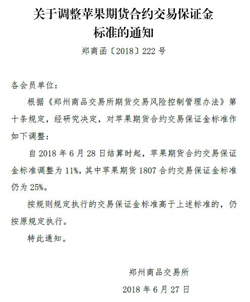中證網(wǎng)訊(記者 陸靜) 鄭商所網(wǎng)站6月27日發(fā)布通知稱,自2018年6月28日結(jié)算時起,蘋果期貨合約交易保證金標(biāo)準(zhǔn)調(diào)整為11%,其中蘋果期貨1807合約交易保證金標(biāo)準(zhǔn)仍為25%。