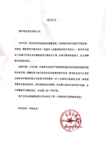 為此,南華期貨的風(fēng)險(xiǎn)管理子公司南華資本積極響應(yīng) “發(fā)動(dòng)期貨行業(yè)力量,眾志成城抗擊疫情”的號召,根據(jù)企業(yè)實(shí)際復(fù)工產(chǎn)能情況主動(dòng)為江西云鴿免費(fèi)提供了一份“階梯二元·橡膠期權(quán)”。其中合約標(biāo)的為RU2005,為期兩個(gè)月,第一個(gè)月生效100噸,同時(shí)自動(dòng)生效次月的200噸期權(quán),合計(jì)300噸天然橡膠,相當(dāng)于保障了約450萬副醫(yī)用橡膠外科手套生產(chǎn)的原材料成本。若最終RU2005價(jià)格超過約定保障價(jià),江西云鴿將獲得南華資本的賠付,有效降低其采購醫(yī)用橡膠外科手套的原料價(jià)格風(fēng)險(xiǎn),保障疫情期間醫(yī)用橡膠外科手套的生產(chǎn)供應(yīng)。與此同時(shí),為了表達(dá)對奮戰(zhàn)在抗“疫”一線的醫(yī)護(hù)人員的敬意,南華期貨聯(lián)合杭州橡膠同業(yè)會(huì),共同出資向江西云鴿購買共計(jì)6萬副,約150箱醫(yī)用手套,無償捐獻(xiàn)給在杭醫(yī)療機(jī)構(gòu),共同抗“疫”。