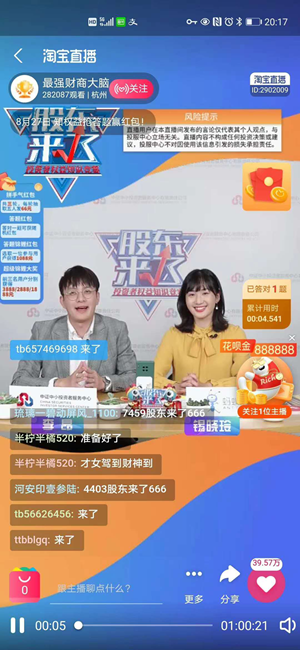 中證網(wǎng)訊(記者 周松林)據(jù)中證中小投資者服務(wù)中心(簡稱投服中心)8月28日消息,8月27日19:00-20:00,《股東來了》2020精心籌備的網(wǎng)絡(luò)直播在支付寶理財(cái)頻道直播平臺上進(jìn)行,1小時吸引超28萬人次觀看,取得圓滿成功。這是《股東來了》投資者權(quán)益知識競賽創(chuàng)辦3年來歷史上首次舉辦實(shí)時直播答題活動。