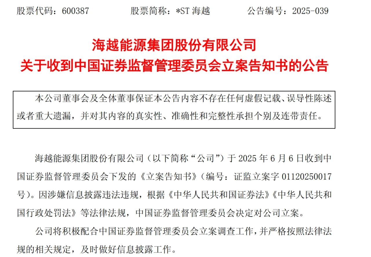 6月6日晚,*ST海越發(fā)布公告稱,公司6月6日收到上海證券交易所《關(guān)于海越能源集團股份有限公司股票終止上市的決定》。同日,公司收到證監(jiān)會下發(fā)的《立案告知書》,因涉嫌信息披露違法違規(guī),公司被立案。