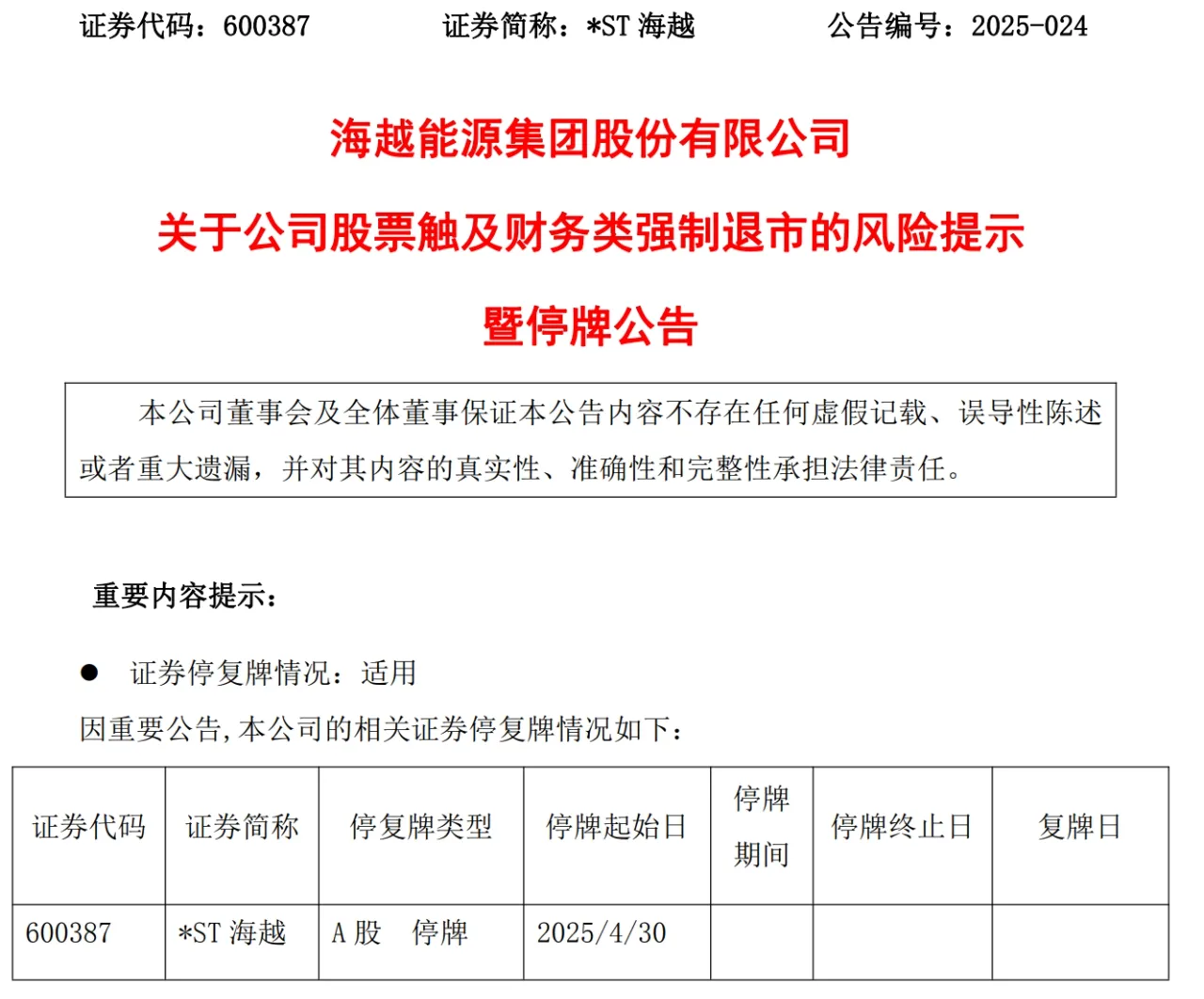 目前,*ST海越正處于停牌狀態(tài),原因為4月30日公司披露的2024年年度報告,被年審機構(gòu)出具了無法表示意見的審計報告,同時,年審機構(gòu)對公司內(nèi)部控制審計,也給出了否定意見的內(nèi)控報告。鑒于上述情形,依據(jù)相關(guān)規(guī)定,公司并不滿足撤銷退市風(fēng)險警示的條件,且已觸發(fā)終止上市情形,進(jìn)而導(dǎo)致公司股票停牌。