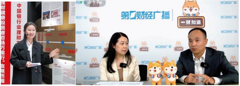 左圖:講解團(tuán)講解《中國銀行業(yè)理財發(fā)展史》,右圖:媒體合作投教—直播課程《理財課堂》直播