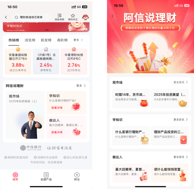 為踐行金融為民服務宗旨,履行國有金融機構(gòu)為民服務使命責任,在2020年理財業(yè)務凈值化轉(zhuǎn)型初期,中信銀行已開始在手機銀行APP線上主渠道,開設(shè)了“阿信說理財”欄目,對理財產(chǎn)品新知識和投資技巧進行投教宣傳。隨著凈值化轉(zhuǎn)型過渡期結(jié)束,中信銀行APP功能也不斷升級,引入了理財公司“幸福號”商鋪,上線了資訊頻道功能,進一步打通了投教內(nèi)容運營體系。2024年,中信銀行線上投教陣地“阿信說理財”迎來了全面升級,實現(xiàn)了基礎(chǔ)知識與實時資訊相結(jié)合、一個內(nèi)容體系與多點輸出相結(jié)合、文字內(nèi)容與聲頻、音頻多媒體內(nèi)容相結(jié)合、知識傳播與線上投教活動相結(jié)合的理財投教運營機制。