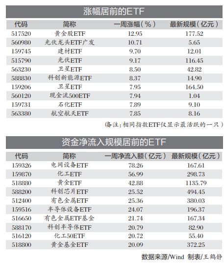 在輪動行情下,場內(nèi)資金大舉涌向行業(yè)主題ETF。近期,黃金、化工、電網(wǎng)、半導(dǎo)體設(shè)備等熱門主題ETF不僅表現(xiàn)活躍,而且吸引了大量資金。上周,黃金ETF凈流入超百億元,跟蹤細(xì)分化工、電網(wǎng)設(shè)備主題、半導(dǎo)體材料設(shè)備等指數(shù)的ETF均吸引超30億元資金凈流入。