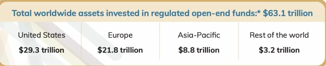 美國投資公司協(xié)會統(tǒng)計顯示, 截至2020年底,全球受監(jiān)管的開放式基金總規(guī)模為63.1萬億美元。美國受監(jiān)管的開放式基金規(guī)模為29.3萬億美元,歐洲為21.8萬億美元,亞太地區(qū)為8.8萬億美元,全球其余地區(qū)合計3.2萬億美元。