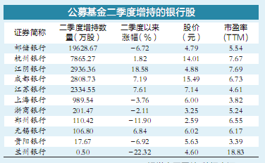中國證券報記者統(tǒng)計發(fā)現(xiàn),基金二季度配置銀行股意愿整體有所下降,但杭州銀行、江蘇銀行、成都銀行、江陰銀行等城農(nóng)商行在二季度被逆勢增持。