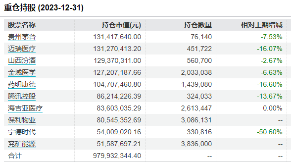 2023年四季度,交銀瑞豐減持了貴州茅臺、邁瑞醫(yī)療、山西汾酒、金域醫(yī)學、藥明康德、騰訊控股、寧德時代,同時新進保利物業(yè)、兗礦能源為前十大重倉股。