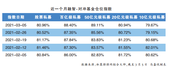 數(shù)據(jù)顯示,截至3月5日,股票私募整體倉位指數(shù)為80.96%,環(huán)比上周小幅提升了0.44個(gè)百分點(diǎn)。