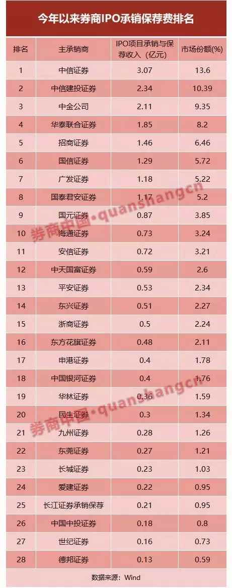 其中,中信證券和中信建投證券IPO項(xiàng)目承銷(xiāo)與保薦費(fèi)穩(wěn)居行業(yè)前二名,市場(chǎng)份額均超過(guò)10%,這兩家龍頭投行今年以來(lái)IPO項(xiàng)目承銷(xiāo)與保薦收入分別為3.07億元、2.34億元。