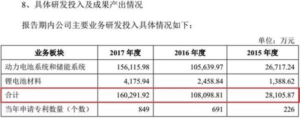 從數(shù)據(jù)方面來(lái)看,2015年寧德時(shí)代的研發(fā)投入為2.81億元,但是到了2017年,研發(fā)投入已經(jīng)達(dá)到16.03億元,兩年間,研發(fā)投入增長(zhǎng)了近5倍。
