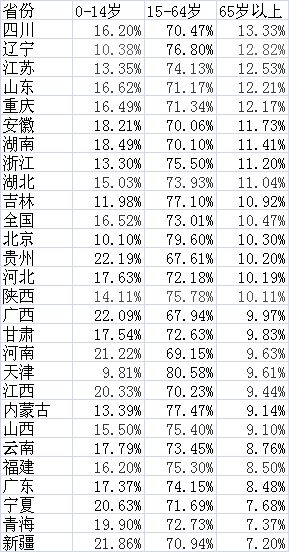 表:27個(gè)省份常駐人口年齡構(gòu)成