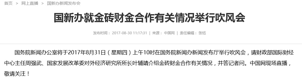 中證網(wǎng)訊 國(guó)務(wù)院新聞辦公室將于2017年8月31日(星期四)上午10時(shí)在國(guó)務(wù)院新聞辦新聞發(fā)布廳舉行吹風(fēng)會(huì),請(qǐng)財(cái)政部國(guó)際財(cái)經(jīng)中心主任周強(qiáng)武、國(guó)家發(fā)展改革委對(duì)外經(jīng)濟(jì)研究所所長(zhǎng)葉輔靖介紹金磚財(cái)金合作有關(guān)情況。
