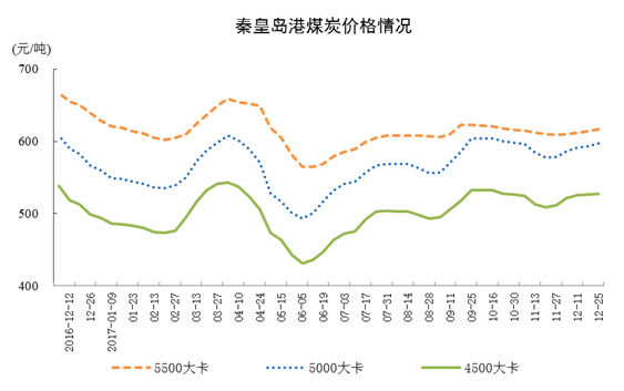截至12月底,秦皇島5500大卡煤炭平倉(cāng)價(jià)617元/噸,比11月底上漲8元/噸;5000大卡597元/噸,上漲19元/噸;4500大卡527元/噸,上漲15元/噸。