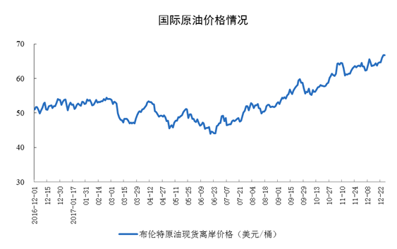 原油價(jià)格持續(xù)回升。12月份,布倫特原油現(xiàn)貨離岸價(jià)格整體保持上漲趨勢(shì)。截至12月29日,價(jià)格為66.7美元/桶,比11月底上漲3.2美元/桶。