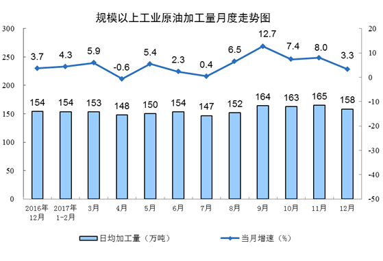 受企業(yè)停產(chǎn)檢修等因素影響,原油加工量增速放緩。12月份,原油加工量同比增長(zhǎng)3.3%,增速比11月份回落4.7個(gè)百分點(diǎn);日均加工量158.4萬噸,比11月份減少6.3萬噸。主要成品油生產(chǎn)增速均有回落,其中汽油、煤油和柴油產(chǎn)量增速分別比11月份回落7.8、1.3和2.9個(gè)百分點(diǎn)。1-12月份,原油加工量5.7億噸,同比增長(zhǎng)5.0%。