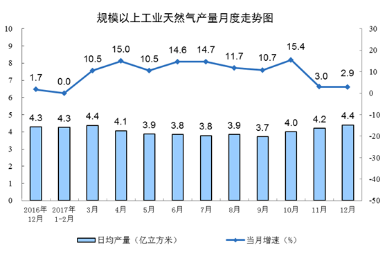隨著煤炭減量替代政策的實(shí)施、“煤改氣”工程的推進(jìn),國(guó)內(nèi)天然氣消費(fèi)需求量持續(xù)攀高,12月份,天然氣產(chǎn)量136.1億立方米,月產(chǎn)量為歷史新高,同比增長(zhǎng)2.9%,增速與11月份基本持平;日均生產(chǎn)4.4億立方米,比11月份增加0.2億立方米。1-12月份,天然氣產(chǎn)量1474.2億立方米,同比增長(zhǎng)8.5%。