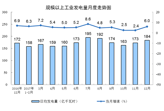 12月份,全國(guó)平均氣溫較上年同期偏低1.9℃,受寒潮天氣及煤改電政策等的影響,用電需求增加,電力生產(chǎn)加快,發(fā)電量同比增長(zhǎng)6.0%,增速比11月份加快3.6個(gè)百分點(diǎn),日均發(fā)電量183.8億千瓦時(shí),比11月份增加10.6億千瓦時(shí)。
