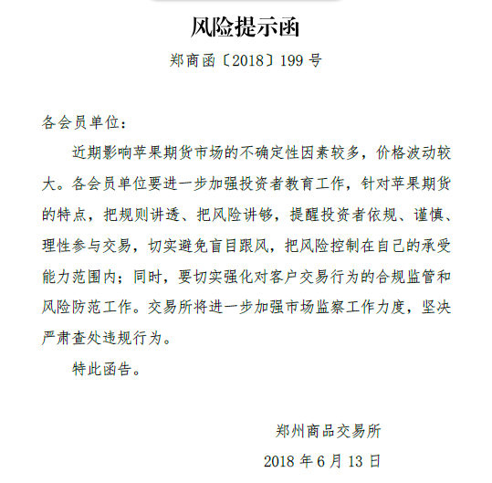 中證網(wǎng)訊 鄭商所網(wǎng)站6月13日發(fā)布風(fēng)險(xiǎn)提示函,提示函顯示,近期影響蘋果期貨市場(chǎng)的不確定性因素較多,價(jià)格波動(dòng)較大。提醒投資者依規(guī)、謹(jǐn)慎、理性參與交易,切實(shí)避免盲目跟風(fēng),把風(fēng)險(xiǎn)控制在自己的承受能力范圍內(nèi);同時(shí),交易所將進(jìn)一步加強(qiáng)市場(chǎng)監(jiān)察工作力度,堅(jiān)決嚴(yán)肅查處違規(guī)行為。