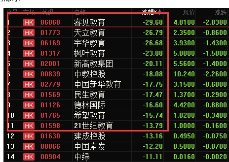 受上述消息影響,周一(13日)上午,在港上市的內(nèi)地教育股集體重挫,多只個(gè)股跳空低開(kāi),跌幅逾30%。截至發(fā)稿,宇華教育跌幅近30%,新高教集團(tuán)下跌超20%,中國(guó)新華教育、希望教育跌幅均在18%以上。