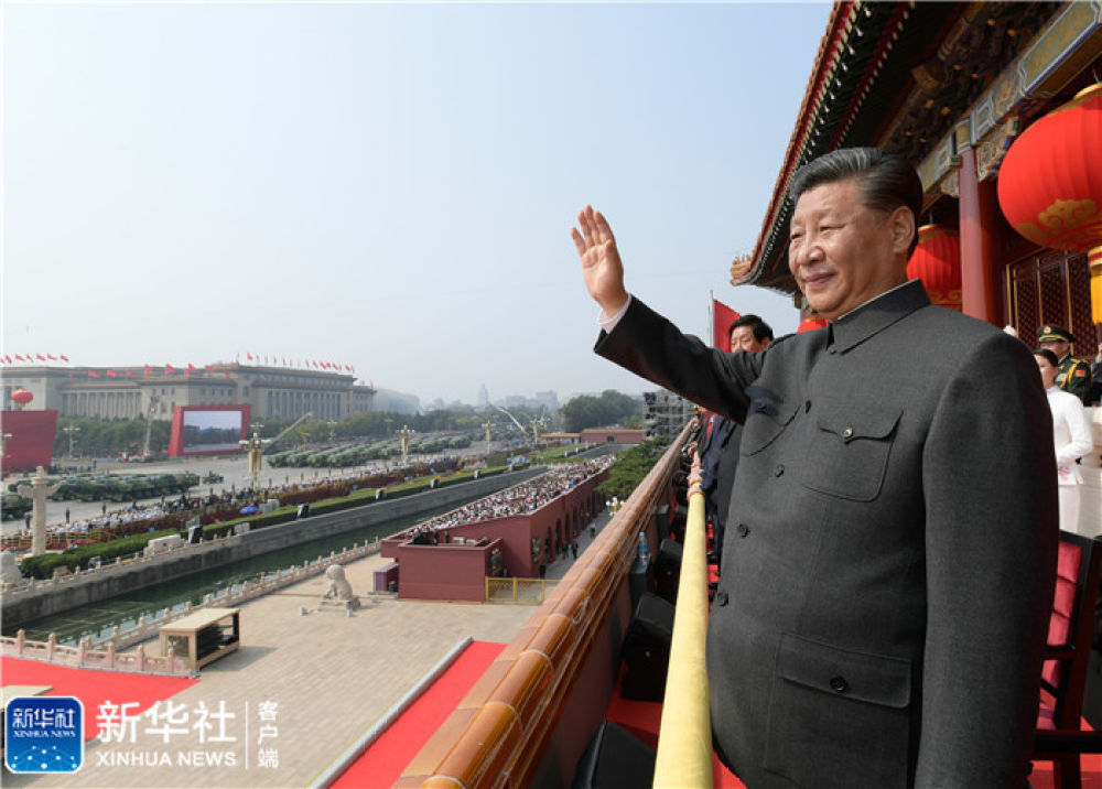 上午9時(shí)57分,在歡快的樂曲聲中,習(xí)近平等黨和國家領(lǐng)導(dǎo)人來到天安門城樓主席臺,向廣場觀禮臺上的各界代表揮手致意。全場爆發(fā)出雷鳴般的掌聲。