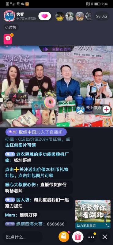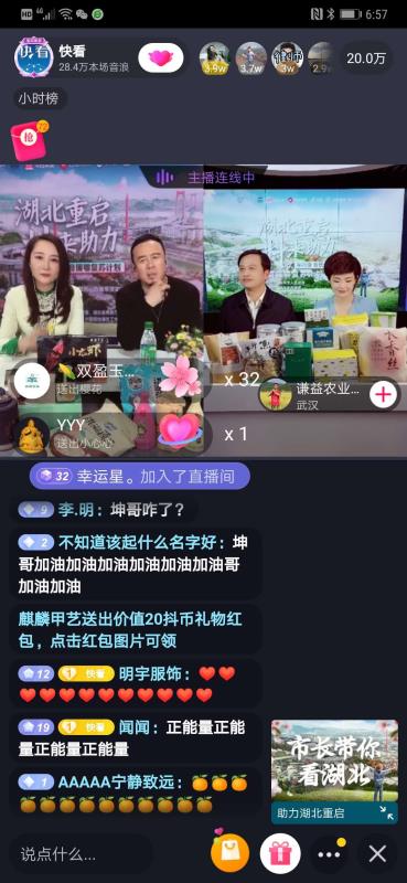據(jù)不完全統(tǒng)計(jì),此次由新華社新媒體中心、音視頻部、“快看”財(cái)經(jīng)平臺(tái)聯(lián)合抖音邀請(qǐng)來(lái)自湖北黃岡、恩施、荊州、荊門、十堰5位市州長(zhǎng)參加和嘉賓楊坤做客的直播,短短兩個(gè)半小時(shí)內(nèi),銷售15種當(dāng)?shù)靥厣r(nóng)產(chǎn)品50多萬(wàn)件。