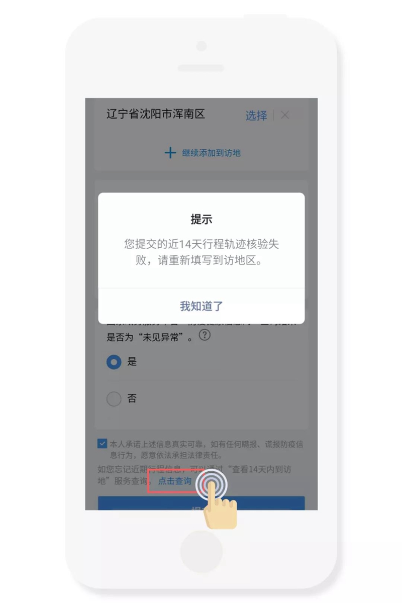 如果不確定14天到訪地區(qū)或提示14天行程軌跡核驗(yàn)失敗時(shí),可點(diǎn)擊頁(yè)面底部提示中的“點(diǎn)擊查詢(xún)”進(jìn)行確認(rèn),頁(yè)面會(huì)跳轉(zhuǎn)到“通信大數(shù)據(jù)行程卡”,即可進(jìn)行行程查詢(xún)。