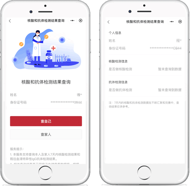 查家人:本服務還支持通過證件號實名查詢家人相關檢測結(jié)果信息,點擊“查家人”一鍵查詢,全家安心。