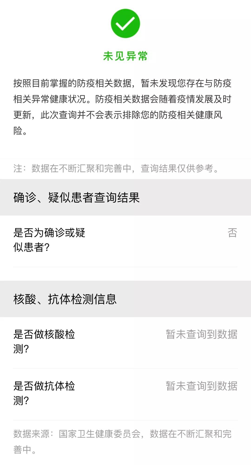 如核酸檢測結(jié)果為陰性,則防疫健康風險狀態(tài)顯示“未見異!。