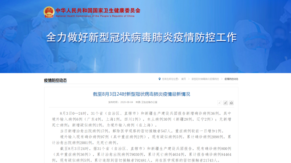 截至8月3日24時,據(jù)31個。ㄗ灾螀^(qū)、直轄市)和新疆生產(chǎn)建設(shè)兵團報告,現(xiàn)有確診病例800例(其中重癥病例36例),累計治愈出院病例79030例,累計死亡病例4634例,累計報告確診病例84464例,現(xiàn)有疑似病例5例。累計追蹤到密切接觸者792481人,尚在醫(yī)學(xué)觀察的密切接觸者21743人。
