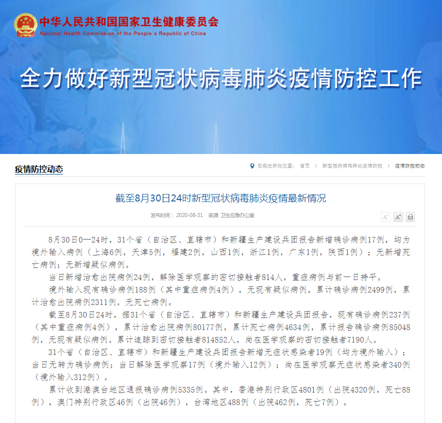截至8月30日24時(shí),據(jù)31個(gè)。ㄗ灾螀^(qū)、直轄市)和新疆生產(chǎn)建設(shè)兵團(tuán)報(bào)告,現(xiàn)有確診病例237例(其中重癥病例4例),累計(jì)治愈出院病例80177例,累計(jì)死亡病例4634例,累計(jì)報(bào)告確診病例85048例,無現(xiàn)有疑似病例。累計(jì)追蹤到密切接觸者814852人,尚在醫(yī)學(xué)觀察的密切接觸者7190人。